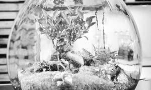 Begin by lining the bottom of the terrarium with a drainage layer that is needed to help keep the roots from rotting in a very humid environment. Next, layer crushed charcoal lightly covered with a thin layer of pebbles or gravel. Following next is a layer of sphagnum moss whose purpose is to prevent the soil from sifting into the bottom drainage layer. The top is a layer of soil or media – ideally a potting soil mix laced with sand. To make your own media use two parts soil to one-part coarse sand and one-part compost. This soil layer is typically where you create your landscape by creating hills, terraces and hollows.