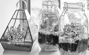 Once winter has finally settled in, then the indoor garden projects can begin. A terrarium is a beautiful, selfcontained, self-sustaining environment – one which emulates a greenhouse on a smaller scale. A terrarium is a miniature ecosystem that can be closed or open. They operate on the same principles as a self-sustaining ecosystem. The rain falls, then evaporates into the air, gathers in the clouds and then once again falls to the earth. It is an example of the beautiful cycle of nature.