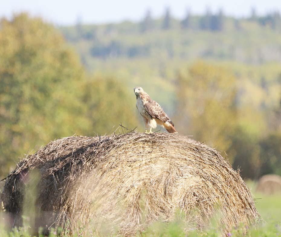 Perched upon a bale along Highway 262 in Scandinavia, this red-tailed hawk was standing tall as it surveyed the ground for its next meal. These birds primarily eat rodents, but also consume other small animals like birds and snakes. The majority of these birds migrate south for the winter, but tend to be visible in Manitoba year-round.