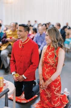 The celebration kicked off with a private Indian ceremony at Melissa and Tarang’s home the day before the wedding. A Mehndi night at Midnight Mulligan welcomed guests to town, with a henna artist and Indian snacks. On the day of the wedding, the couple held a Chinese tea ceremony with family, and a Baraat, a joyous procession of song and dance that ushers the groom to the wedding. The fusion of cultures called for several outfits: Melissa wore four.