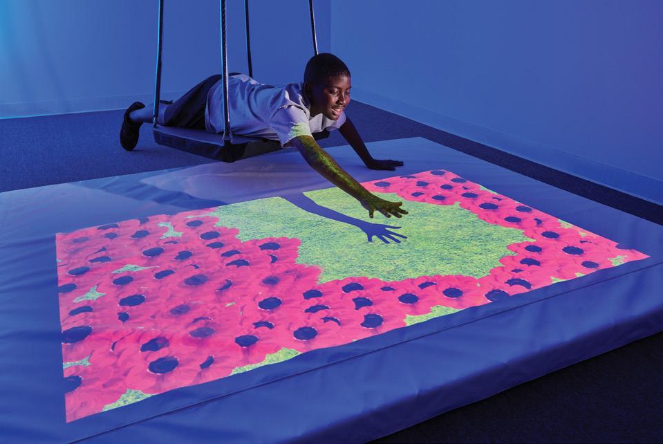 The patented "trail" design is to encourage exploration, leading the client from one texture to another in a fluid and organic way. Each texture offers its own properties that are unusual to find in normal life and even rarer for those with limited movement.