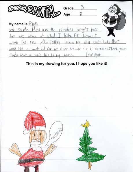 Dear Santa, I hope you and your wife are doing well. I’m happy to report that I’m listening better at scool. For Christmas, I would love an electric scooter, a hockey stick, and boxing gloves. May be you can leave a tret for Ruby. I will leave out some milk and cookies.