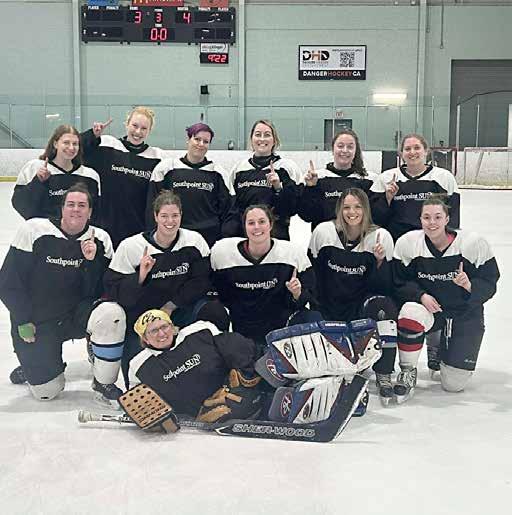 On Monday March 31, Southpoint Sun faced off against Sunparlour Locksmith for the championship game in the Southpoint Monday Night Ladies Hockey League. It was a rocky start for the Sun as they were down 2-0 halfway through the second period. Then they turned the jets on with a beautiful five-hole goal scored by Danielle Simpson-Watson, followed by Lea Marshall who scored to tie the game, assisted by Kathryn Ciacelli. The third period came with excitement as linemates Jess Cecile and Kim Goyeau had back-to-back goals, assisting each other, upping the score to 4-2. Locksmith scored late in the third, but it wasn’t enough. As the final buzzer went, Southpoint Sun came out on top with a 4-3 win. Left to right, in the back row, are Kathryn Ciacelli, Mackenzie Mahon, Danielle Simpson-Watson, Lea Marshall, Krista Marshall, Taryn Azzopardi. In the middle row are Joy Tremblay, Kim Goyeau, Jess Cecile, Jaclyn Woelk, Lexy Tulett. In front is goaltender Tina Manning. Absent: Brie Davis.