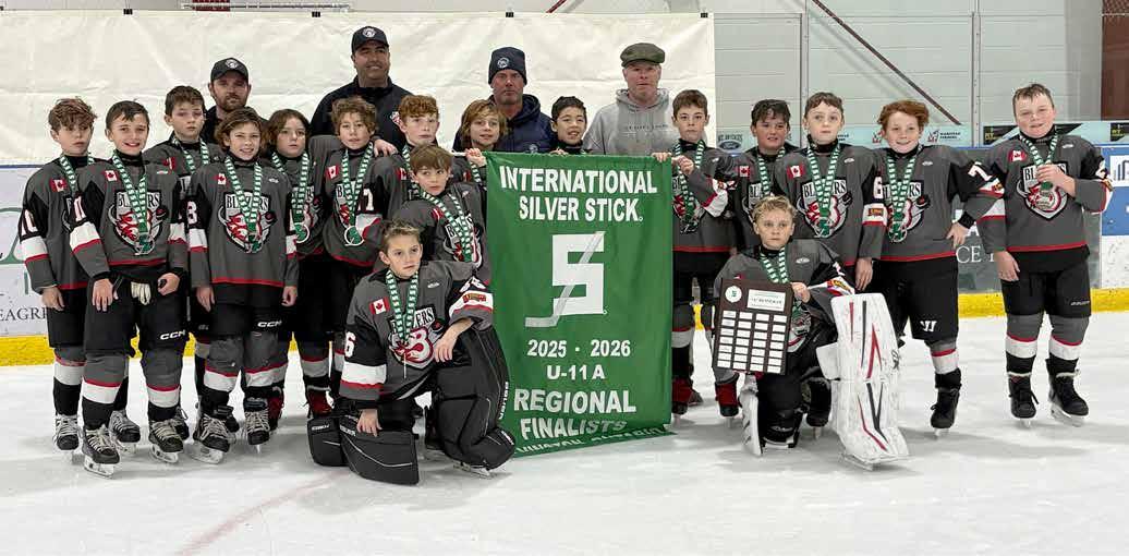 The U11A Talbot Trail Blazers powered their way to a silver-medal finish at the Regional Silver Stick tournament in Alvinston on the December 5-7 weekend, posting four statement wins over some of Ontario’s top-ranked teams before falling to a tough Woodstock squad in the championship final. The Blazers played with grit and represented their program with pride, from puck drop to final buzzer. In back row, from left, are coaches Rob Primeau, Joe Barrette, Thomas Grubb, Joe McLeod. In the middle row are Maverick Larade, Xavier Barrette, Brett Primeau, Denver Charette, Nolan Agueda, Liam Hall, Angus McLeod, Grady Grubb, Blake Finn, Mack Marshall, Ryan Bailey, Mason Lalonde, Johnny Lougheed, Jackson Bondy, Blake Wright. In front are goalies Finley Furtado and Ethan Liebrock. Coach Colm Smith was absent for the photo.