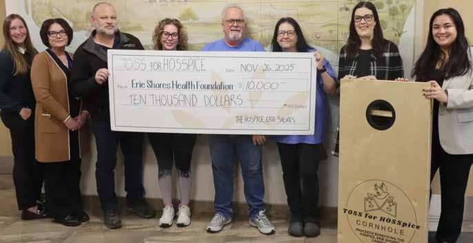 The “Toss for Hosspice” cornhole group presented a cheque for $10,000 at The Hospice Erie Shores Campus on Wednesday, November 26, representing the proceeds from four events held in 2025 across the county.