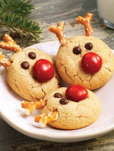 4. Immediately place one M&M in the centre of each cookie for a nose (press down a bit if your cookies aren’t flat enough), 2 mini chocolate chips for the eyes, and 2 pretzel pieces at the top for antlers. Carefully transfer the cookies to a wire rack to cool completely.
