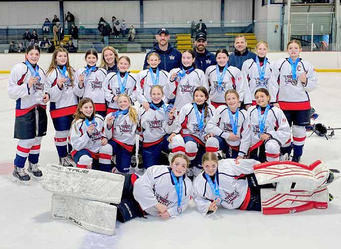 The U13A Southpoint Stars faced the Nepean Wildcats in the Durham West Bolts and Hearts Championship final after going 2–2 in round robin play and winning a thrilling semifinal that was decided in a 16-player shootout to earn their spot in the championship game. They capitalized on two power plays and even scored 4-on-6 to pull within one, but despite a relentless push to the final buzzer, they came up just short. The Stars finished the tournament as proud silver medalists. In the back row, from left, the coaching staff are Trainer Katie Mackie, Coach Mark Epplett, Coach Curtis Anderson, Coach Matt Mastronardi. Third row: Victoria Thompson, Maddie Cardoso, Aly Mastronardi, Tegan Grubb, Eva McKeen, Hannah Falls-Goodyear, Charley Market, Mila Epplett, Wynne St. Aubin. Second row: JJ Dufour, Ella Fleming, Ella Epplett, Balokia Raffoul, Emma Robinson, Milana George. In front are goaltenders Kinsley Sutts and Avery Anderson. Photo submitted