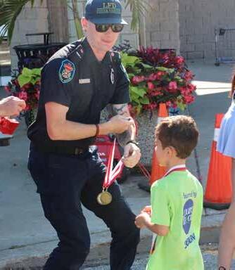 Leamington Fire Services were on hand to give out the medals to the athletes as they finished. Here, firefighter Eric Wright puts a medal on one of the competitors.
