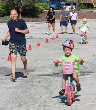 Sarah Huynh was the first athlete out of the pool in the under-5 age group and she was geared up for her bike ride, with dad Tuan following closely behind.
