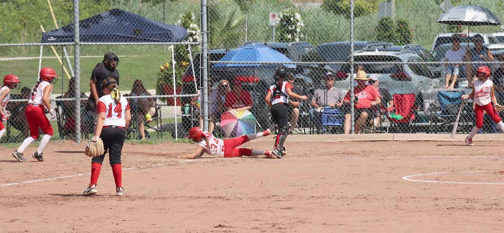 An eight-team tournament for U11 Girls Fastpitch was held in Leamington over the July 25-27 weekend, with teams from as far away as Enniskillen and Corunna taking part. The Leamington U11 Whitecaps fared well in the event, making it to the semi-final before dropping a last-inning heartbreaker to the Windsor Wildcats on Sunday morning. In the photo, Whitecaps slugger Emma Robinson slides into home plate during the semi-final game on the tail end of her inside-the-park grand slam, which put Leamington up 6-2 at the time. The Wildcats came back and won the game 9-8, before dropping the championship game to LaSalle Gold. The Whitecaps came up short to Enniskillen in the bronze medal game by a 12-11 score.