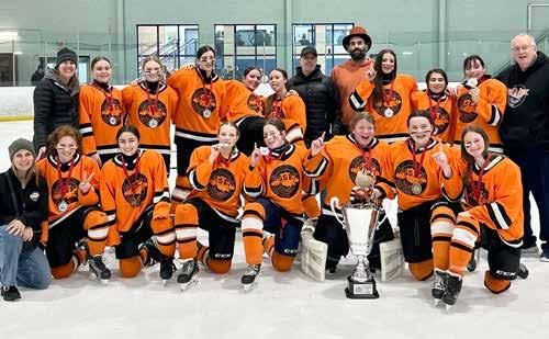 The U15 Essex Thunder Orange team captured gold at the Keith Lindsay Memorial Tournament in Leamington on the weekend of March 6-8. The team opened the tournament with a 3-1 win over Lakeshore Lightning Grey and followed that up with a 6-0 shutout of South County Blue. The Thunder finished their round-robin portion with a 1-1 tie against Lakeshore White. In the semi-final, Essex edged Woolwich 2-1 to advance to the championship game. The final featured a rematch with Lakeshore White and was a tightly contested game, highlighted by strong team defence and goaltending. The Thunder came out with a 1-0 win for the championship. Back row, from left, are Trainer Lisa Wallace, Reese Baillargeon, Cora Tiessen, Kate Wallace, Eva Patterson, Vanessa Gouin, Coach Nick Montcalm, Coach Eric Vickerd, Brihana Glass, Alexis Vickerd, Brinley Couvillion, Coach Gary Armstrong. In front are Trainer Jana Tiessen, Kaiah Dame, Sofia Peralta, Maryn Geelen, Pearl Montcalm, goalie Aubrey Robinson, Rebecca Deman and Veronica Tsykalova. Absent was Isabelle DeZori. Photo submitted