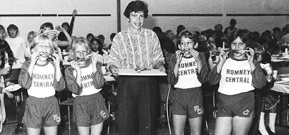 1985 - A long-standing tradition at Romney Central School was continued on Thursday afternoon. It has been the custom on the Thursday preceding Thanksgiving to hold a giant Thanksgiving dinner complete with turkey and all the trimmings for the students, staff and members of the Romney Central “family”. To get into the spirit of the occasion, four of the students, along with teacher Mrs. Zittlau, gave a bone-gnawing demonstration for the Journal
