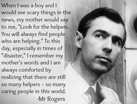 One email caught my attention. It’s a quote that apparently Fred Rogers said. For those who don’t recognize his full name, he was Mr. Rogers, from the Television show Mr. Rogers’ Neighbourhood which ran for 33 years during the 1960s, ’70s and ’80s. I guess, it’s not so much of a quote, as it is a thought. He said when bad things happen, look for the helpers. When catastrophes happen there are those people, those helpers, who step up and help those affected.