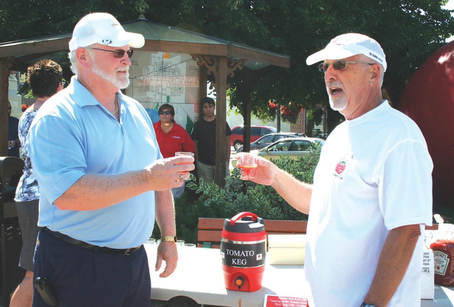 Leamington Mayor John Paterson, left, and Leamington Tomato Festival Chair Dave Campbell had the honours of tapping the tomato juice keg to officially open the 28th annual festival on Wednesday, August 17. The Tomato Festival Golf Tournament was held that afternoon at Erie Shores Golf Course. (SUN Photo)