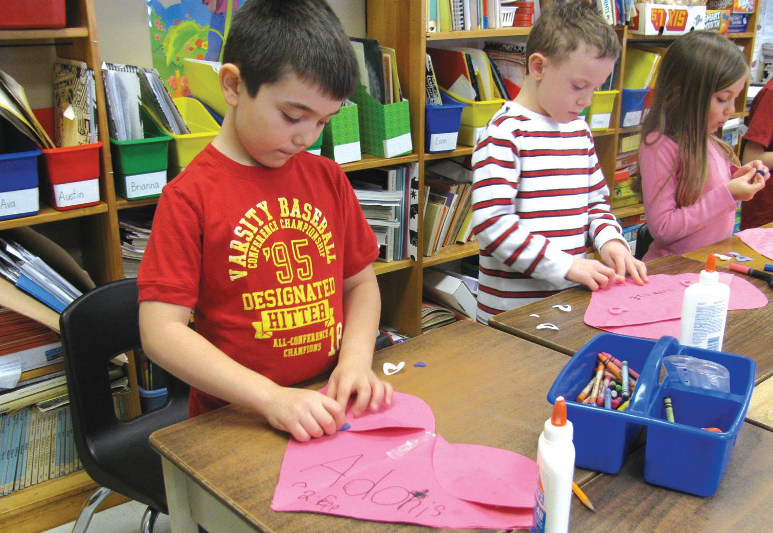 Grade 2 students Adonis, Nathan and Briana work on their Valentine’s Day craft.