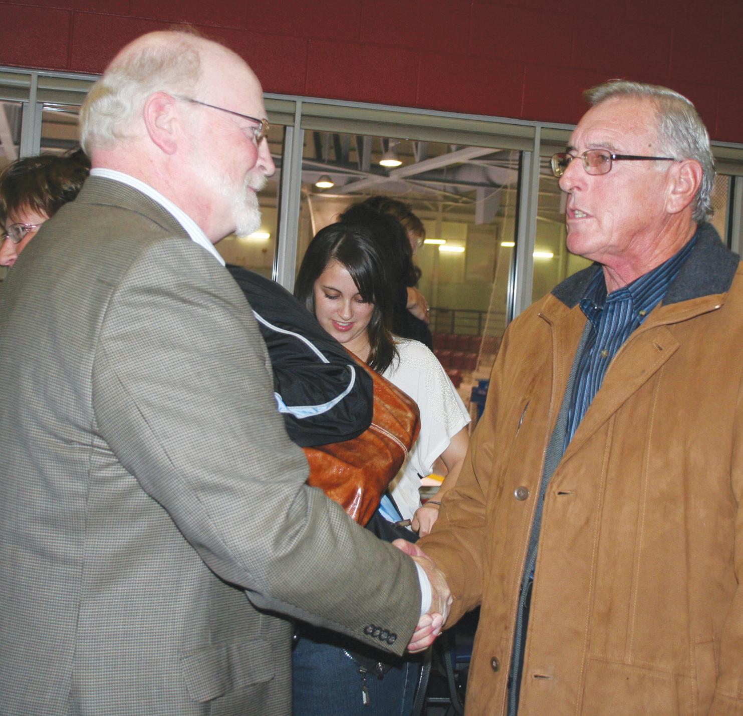 John Paterson, left, and John Adams, right, shake hands after the announcement that Patterson will be Leamington’s new mayor.