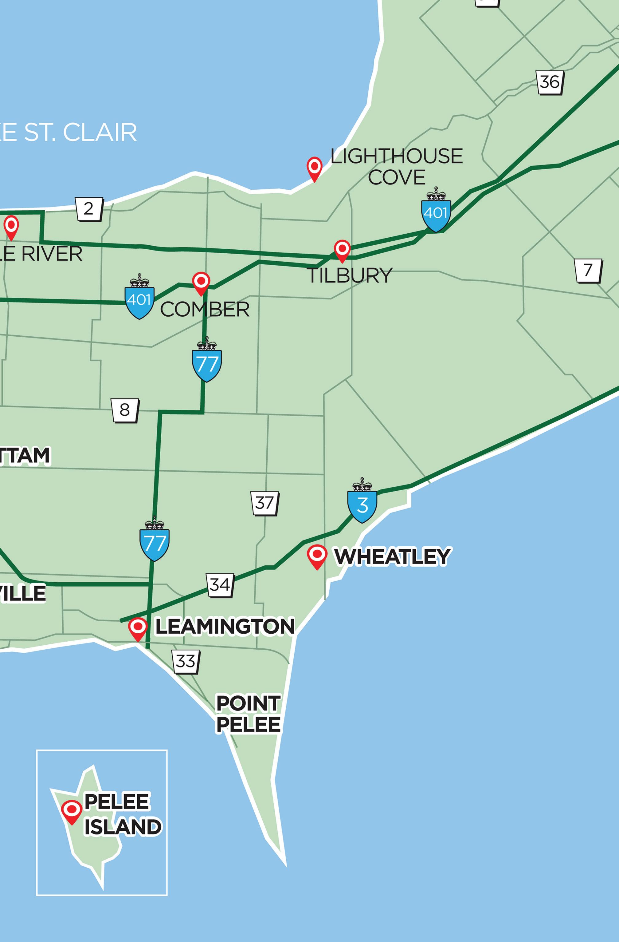 • Pelee Island is 30 km south of Leamington and covers 10,000 acres. It is 12.5 km long and 6 km wide.