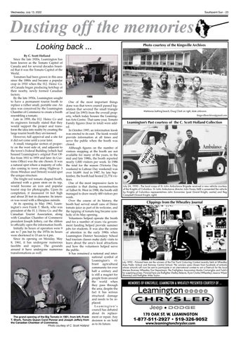 done was that town council passed legislation that severed the small triangle Mettawas bathing beach, Doug Clark on right, date unknown. of land (in 1993) from the overall propA Look at Leamington’ s Past courtesy of C. Scott Holland kingsvillearchives@gmail.com erty, which today houses the Leamington Arts Centre. That same year, Tomato Leamington’s Past courtesy of the C. Scott Holland Collection Family figures (four in total) were added. In October 1995, an information kiosk April 1973: was erected to its east. The kiosk would Buckingham Real Estate provide information at all times and edged Gulliver serve the public when the booth was Insurance 2-1 to closed. win the Midget Although figures on the number of hockey trophy. visitors stopping at the booth are not At left is captain available for many of the years, in the Ken Dick who mid and late 1980s, the booth reported scored both nearly 1,000 visitors per week. In 1986 goals with coach the total for the season (Victoria Day Randy Critchlow. weekend to Labour Day weekend) was over 16,689. And in 1987, by late September, the booth had hosted 21,774 visitors. One of the most impressive facts to July 24, 1990 - The local corps of St. John Ambulance Brigade received a new vehicle courtesy consider is that during reconstruction of the Knights of Columbus. St. John Ambulance director John Dorey (left) is presented the vehicle of Talbot St. West in 1988, the booth still by Knights of Columbus representatives John Surowniec (past Grand Knight, centre) and Reg managed to draw nearly 400 visitors per Campbell (Grand Knight, right). week. Clippings from the Wheatley Journal, May 1989 Over the course of its history, the Clippings from the Wheatley Journal booth had served small cans of Heinz tomato juice as part of its welcome, and the tapping of tomato keg became symbolic of its May opening. Volunteers helped operate the booth and for a number of years via government funding helped provide summer jobs for students. It was also the centre of attention in the early 1990s when Leamington District Secondary School had tourism classes make daily visits to learn about the area’s local attractions and how the volunteers helped serve the public. It has remained a national and international symbol of Leamington’s viJuly 1992 - Pictured here are the winners of the Fire Truck Colouring Contest recenlty held at Wheatley brant agricultural Area Public School and Romney Central School. The winners were chosen from hundreds of entrants cycling Ditches foot after foot followingcontest the Thursday evening rainfall whose artwork will -now be sentrose to participate in an international to win a firetruck for the local community for overSubmarine Romney lads Wheatley Fire Department. The Firefighters Association Cartwrights and Fudd’s these young wasted no time inventing a new game,thanks “submarine cycling”. If half a century andand Mersea for supplying prizes. Pictured here are firefighter Shelley Beleutz, Ryan Clarke (Wheatley), Jessica Wiper else, it’s a quick way to wash a ten-speed bicycle! is still a magnet fornothing (Romney) and firefighter Mike Taylor. people from around the world whenMEMORIES OF KINGSVILLE, LEAMINGTON & WHEATLEY PRESENTED COURTESY OF ... MEMORIES OF KINGSVILLE, LEAMINGTON & WHEATLEY PRESENTED COURTESY OF ... they pass through the area, despite the fact it has serious structural damage and needs to be replaced. Leamington’s council has debated about its replace170 OAK ST. W. LEAMINGTON The grand opening of the Big Tomato in 1961, from left, Frank ment or repair. Any T. Sherk, Tomato Queen Carol Penner and Joseph Jeffery from decision is on hold 1-877-511-2927 • 519-326-9052 the Canadian Chamber of Commerce. www.leamingtonchrysler.com as to its future. Photo courtesy of C. Scott Holland