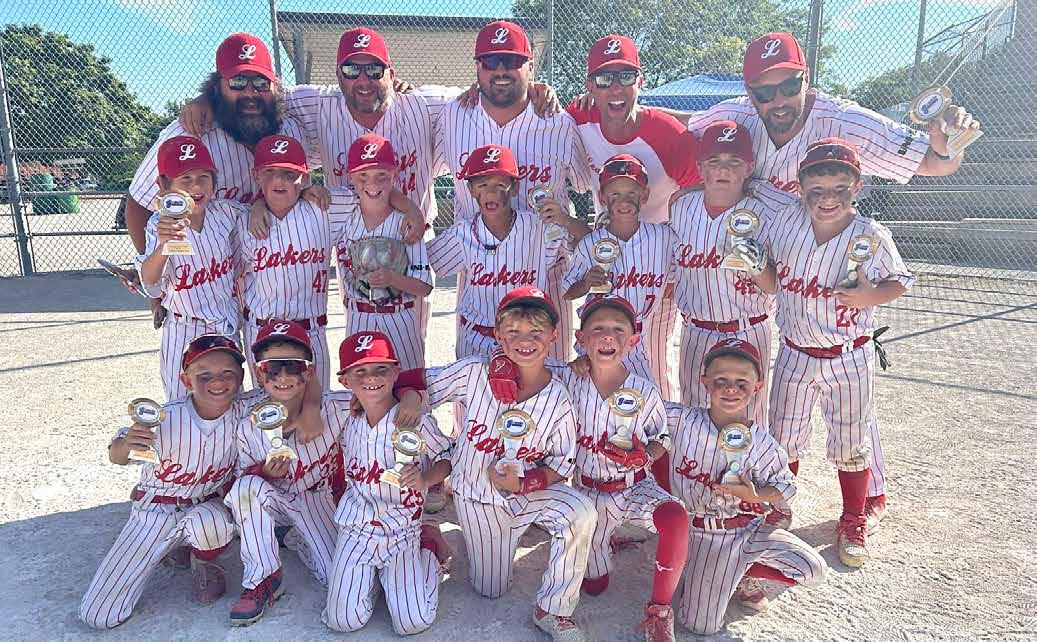 capping it off with an 18-0 win over Brantford in the championship game. Here, they celebrate just after claiming the title. Front row, from left: Theo Wright, Tate Getty, Owen Schiefer, Conor Cobby, Easton O’Neil and batboy Nash O’Neil. Middle row: Rory Mills, David Giesbrecht, Dougie Howe, Maddux Carnevale, Hudson Dyck, Nolan