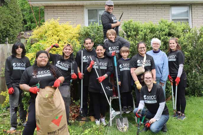 The SECC Lend-A-Hand crew stops for a photo opportunity in Marianne Lasi’s (blue sweatshirt) back yard on Saturday, May 11. SUN photos