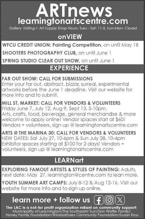 Vol. 15, Issue 16 Wednesday, May 15, 2024 FREE WELCOME BIRDERS Proudly serving Leamington, Kingsville, Wheatley and surrounding area Leamington 519-326-8136 countycoolingandheating@gmail.com Sales Service Installation 519-839-6102 southpointpainter@gmail.com 2680366 Ont Ltd. Follow Us! Free Estimates Call, Text or Email Jim Leamington Fair May 23•24•25•26 Leamington Fairgrounds - 194 Erie St. North Thursday - Gates Open 3 pm • Rides Open 6 pm Friday & Saturday - Live Bands Saturday - Demolition Derby $25 ALL INCLUSIVE ADMISSION 194 TALBOT ST E, UNIT 6, LEAMINGTON 519-325-0007 www.bioped.com • leamington@bioped.com ORTHOTICS CLINIC LEAMINGTON *Spring Sale discount is on selected in-stock, in-clinic only footwear. All sales are final and non-refundable. From The Weather Network WED., MAY 15 THUR., MAY 16 FRI., MAY 17 SAT., MAY 18 SUN., MAY 19 high 19 high 19 high 20 high 22 high 22 high 24 MON., MAY 20 HER