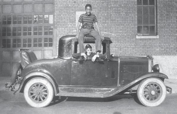 Louie Harris is sitting on the roof of his Wind sor-built 1931 Dodge rumble seat coupe, while his friend Jack Morton sits inside. The photo was taken in Toronto in 1944.