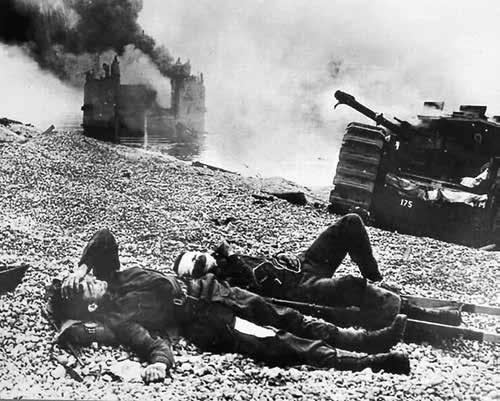 A well circulated photo amongst historians, known as “Brown and Green on Red Beach” in the Time Life book “The Second Front” about WW II, depicts George and a comrade lying side by side on their backs on the stony shore beside an abandoned tank.