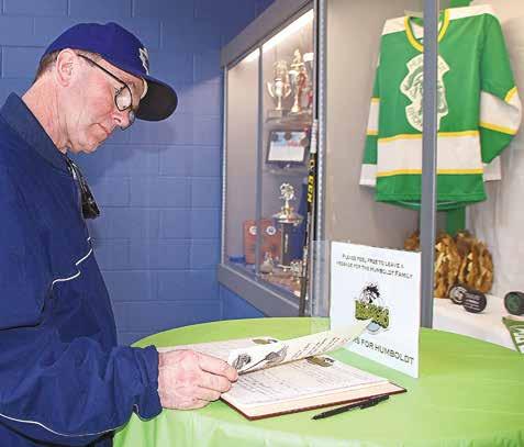 Leamington resident Kevin O’Neil reads through some of the messages left by Leamington Kinsmen Recreation Complex visitors on a registry provided by Reid Funeral Home. The registry was set up as part of a display in the LKRC’s main lobby featuring memorabilia O’Neil collected while serving on the board of directors and as an assistant trainer with the Humboldt Broncos from the late 1970s to mid 1980s.