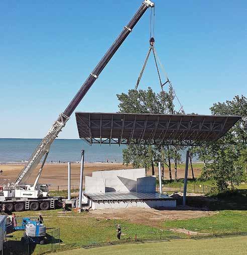 The latest step in the process of revamping Leamington’s water front became visible for all to see on Tuesday, June 27 as the outdoor amphitheatre’s roof was raised and secured to its four support pillars before a crowd of onlookers that included members of municipal council and administration. The foundation of the stage was built roughly two months earlier and although the structure officially began taking on its basic shape upon installation of its 47,000 pound roof, Leamington director of infrastructure services Rob Sharon explained that there are still a handful of steps remaining on the project’s to-do list.