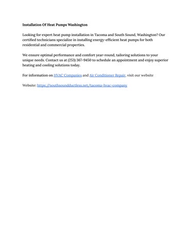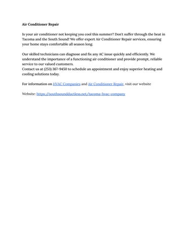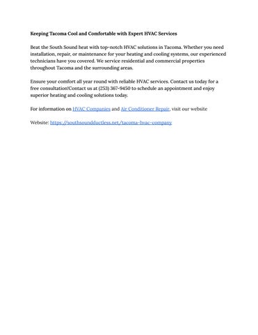Beat the South Sound heat with top-notch HVAC solutions in Tacoma. Whether you need installation, repair, or maintenance for your heating and cooling systems, our experienced technicians have you covered. We service residential and commercial properties throughout Tacoma and the surrounding areas. Ensure your comfort all year round with reliable HVAC services.