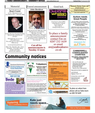 To place a family announcement contact Em on 0207 232 1639 or email em@southwarknews .co.uk