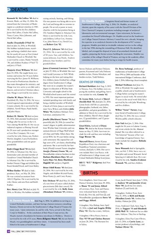 DEATHS Kenneth M. McCaffree ’40 died in Everett, Wash., on May 13, 2016. He retired from the University of Washington as a professor emeritus in 1981. He is survived by his five children: James McCaffree, Charles McCaffree, Nancy Carter, Mary Johnston, and David McCaffree. Anelle (Trumbull) O’Neil ’41 died on July 24, 2016, in Winfield. Her hobbies included music, traveling, and being a faithful choir member for nearly 60 years at First United Methodist Church in Winfield. She is survived by a sister, Mattie Nemeth ’38, and children Rodney O’Neil ’72 and Jerry O’Neil. Marjorie (Gee) Williams ’41 died June 23, 2016. She taught home economics and science for 10 years before marrying the Rev. James H. Williams. He served in Presbyterian churches in four states throughout his ministry, and Marge was very active as an elder and a deacon, and served in Christian education. Marge is survived by two sisters. Charles W. Hayes ’50 died in Rockford, Ill., May 14, 2016. He was a retired regional superintendent of Ogle County schools. He is survived by his children, Terrill Hayes, Paula Steifel, and John Hayes. Robert H. Martin ’50 died on June 23, 2016. Bob attended Southwestern College after his service in the U.S. Navy during World War II. He was an industrial engineer at Boeing Aircraft for 20 years and a production manager at Love Box Company. He is survived by his wife, Gloria; son, Robert Martin; daughter, Laura Richardson; three grandchildren and one greatgrandchild. Ruth (Clegg) Reed ’50 died July 23, 2016, in Arkansas City. She was a homemaker and a devoted member of Grandview United Methodist Church in Arkansas City. She is survived by brother Donnie Clegg and children Jim Reed, Kendall Reed, and Gwen Bailey. Wilbur Rather ’57 died in Independence, Kan., on May 28, 2016. He was a retired accountant from ARCO Pipeline. He is survived by his wife, Dessie; and sons Ron and Keith Rather. Rev. Henry Cox ’59 died on July 19, 2016, in Wichita. His hobbies included
