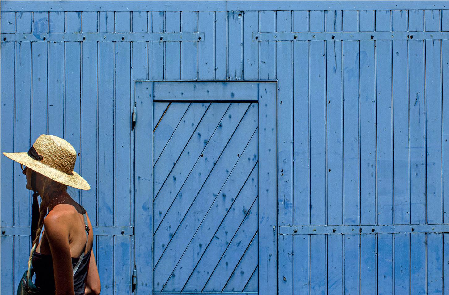 With my street photography I like to place a single figure close to the edge of the frame. I feel that it adds drama and tension to the scene as a split second later, the figure would be gone and just the background would be left in shot. The image here makes use of negative space. This is the area that surrounds the main subject or focal point (the positive space) that can isolate and emphasise that subject and also give a sense of place. I also happen to like the colour of the background here. That blue sets off the straw hat. There is also something else going on here as regards the design. The majority of the space consists of verticals but this is broken up by the diagonals in the centrally placed service door and four horizontal hinge straps.