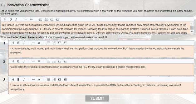 Thei2iPlatformdeploysthe“justintimelearning”techniquetopreparetheresearcherswithProjectLifeCycleknowledge whilemanagingtheirinnovation Thefocusontherealneedsaddressedbythei2iPlatformincreasestheprobabilityof technology adoption The information captured by the i2i Platform provides the AOR/RFS an opportunity to learn and interactwiththeirpartnersinreal-time,whichenablesthemtoguideandselectprojectsearlyonthataddressUSAID's prioritytopics,includingYouth,Gender,andClimateChange