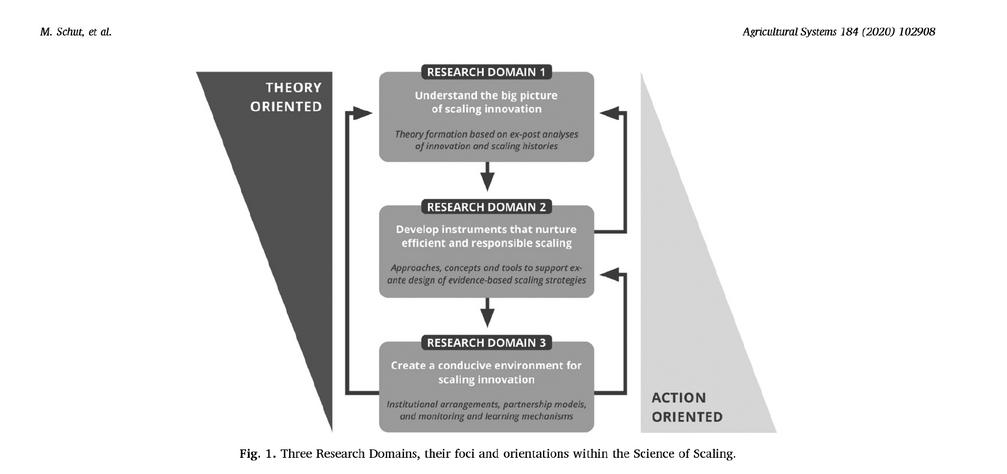 "Achievingimpactatscaleisoneofthegreatestchallengesfacingthedevelopmentcommunity(CGIAR2015),andthe term "scaling" is gaining popularity in the world of public research for development (Hall and Dijkman, 2019) Scaling requires new skills, conditions, and capacities Many AR4D [agricultural research for development] organizations have beguntounderstandthatscalingrequiresdifferentkindsofcapacitiesthanthosepossessedbythetypicalagricultural scientists"-Scienceofscaling:understandingandguidingthescaleofinnovationforsocietaloutcomesbyMarcSchut, CeesLeeuwis,GrahamThiele(2020,pp 1-5)