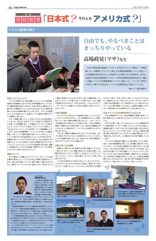 自由でも、やるべきことは きっちりやっている 高場政晃(マサ)先生 日本の現役高校教師が、マカティオ市のカミアック高校に 1 年間在 籍した。兵庫県とワシントン州による教員派遣制度により、学校レベ ルの国際交流をはかることが目的だ。日本語クラスの授業をしながら、 他教科や他校の授業見学、マカティオ学区の教育委員会参加など、幅広 く活動しアメリカの教育事情にどっぷり浸かった。「とにかく学校が 大好き」と言うマサ先生が、アメリカ式教育の良さを語ってくれた。 取材・文:渡辺菜穂子