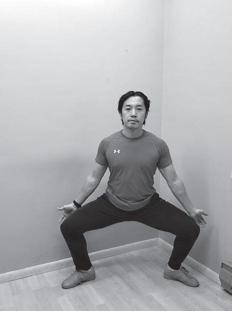 島田耕太■エクササイズ・サイ エンス修士。1998年より個人、 グループ、企業に向けてフィッ トネスおよび栄養コーチング の指導を行う。 プリエ・スクワット 25回を2セット プリエ・スクワットとは、脚を開きながら行 うスクワットのこと。足は肩幅より広めに開 き、つま先は外に向けて立ちます。バランスが 取りにくい場合は壁やテーブルなどに手をつ いてサポートします。その姿勢から、両膝を つま先と同じ方向にそれぞれ曲げていきます。 通常のスクワットと違い、腰を落とすのではな く、膝を開いていくというイメージで行ってみ