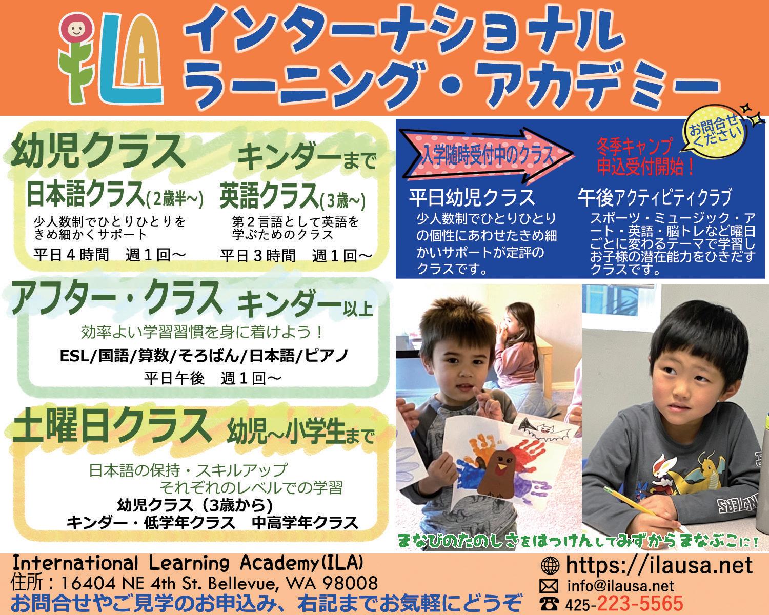 感謝の気持ちをいろいろな表現で伝えてくれます。 ILAで見学随時受け付け中! 平日:幼児クラス(日・英) 平日午後・土曜日:幼児と小中学生対象の日本語補習授業(プラ イベートレッスンあり)、そろばん、英語、スペイン語など 余 春 しゅんこ 子■中国生まれ。横浜国立大学国際社会研究院卒業。1998年 日本に留学後、日本に帰化。多文化のバックグラウンドを生かし、温 かい雰囲気の中で言語学習に取り組める幼児教室としてILAを創立。 ムニョス真樹子■ロンドン英国国際教育研究所の日本語教師養成課 程を修了後、渡米。ロサンゼルスに10年、シアトルに10年在住。発達・ 教育心理学を中心に関連分野を学んでいる。 インターナショナル・ラーニング・ アカデミー(ILA) International Learning Academy 16404 NE. 4th St., Bellevue, WA 98008 ☎425-223-5565 info@ilausa.net www.ilausa.net 余 春子塾長
