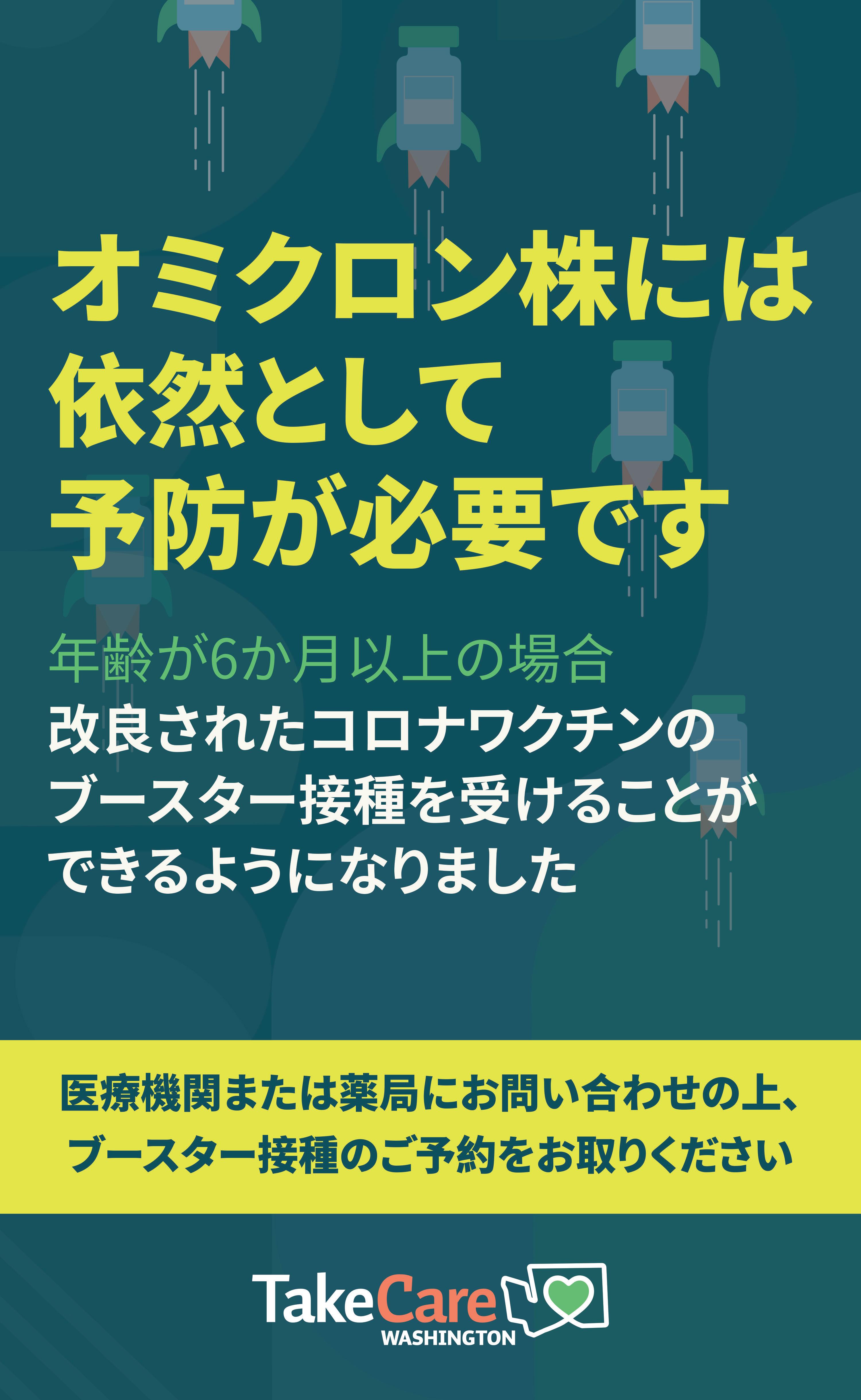 www.covid.gov/tests(連邦政府)、https://sayyescovidhometest.org(ワシントン州) ⃝ワシントン州保健局からのCOVID-19およびワクチン日本語情報 https://doh.wa.gov/ja/covid-19 ⃝ワクチン接種予約が可能な医療機関の検索はこちらから https://vaccinelocator.doh.wa.gov