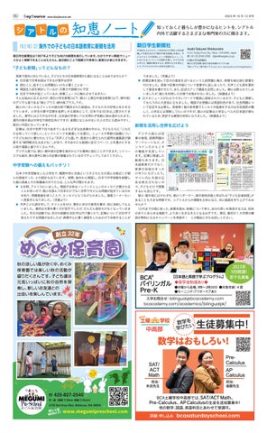 新聞を活用し世界を広げよう デジタル版には記 事の検索、読解問題の ワークシートなど、オ ンラインだからこそ の機能が充実してい ます。記事に関連した 動 画 も あ り ま す。 日 本語教育だけでなく、 家族の会話のきっか け作りにもぴったり。 サイト内に外部の広 告は表示されないの で、子どもだけで閲覧 するにも安心です。 朝小・朝中高にはそれぞれ、朝小リポーター、朝中高特派員と呼ばれる 「子ども記者制度」 が あることも大きな特徴です。シアトルからの情報を日本に伝え、共に紙面を作り上げてみま せんか? 10 代までの間に培った、新聞を読み、物事について考え、自分の思いを発信する力は、将来 のありとあらゆる場面で、より良く生きる支えとなるはずです。現在、最初の1カ月間の購 読が無料になるキャンペーンを実施中! この機会にぜひお試しください。