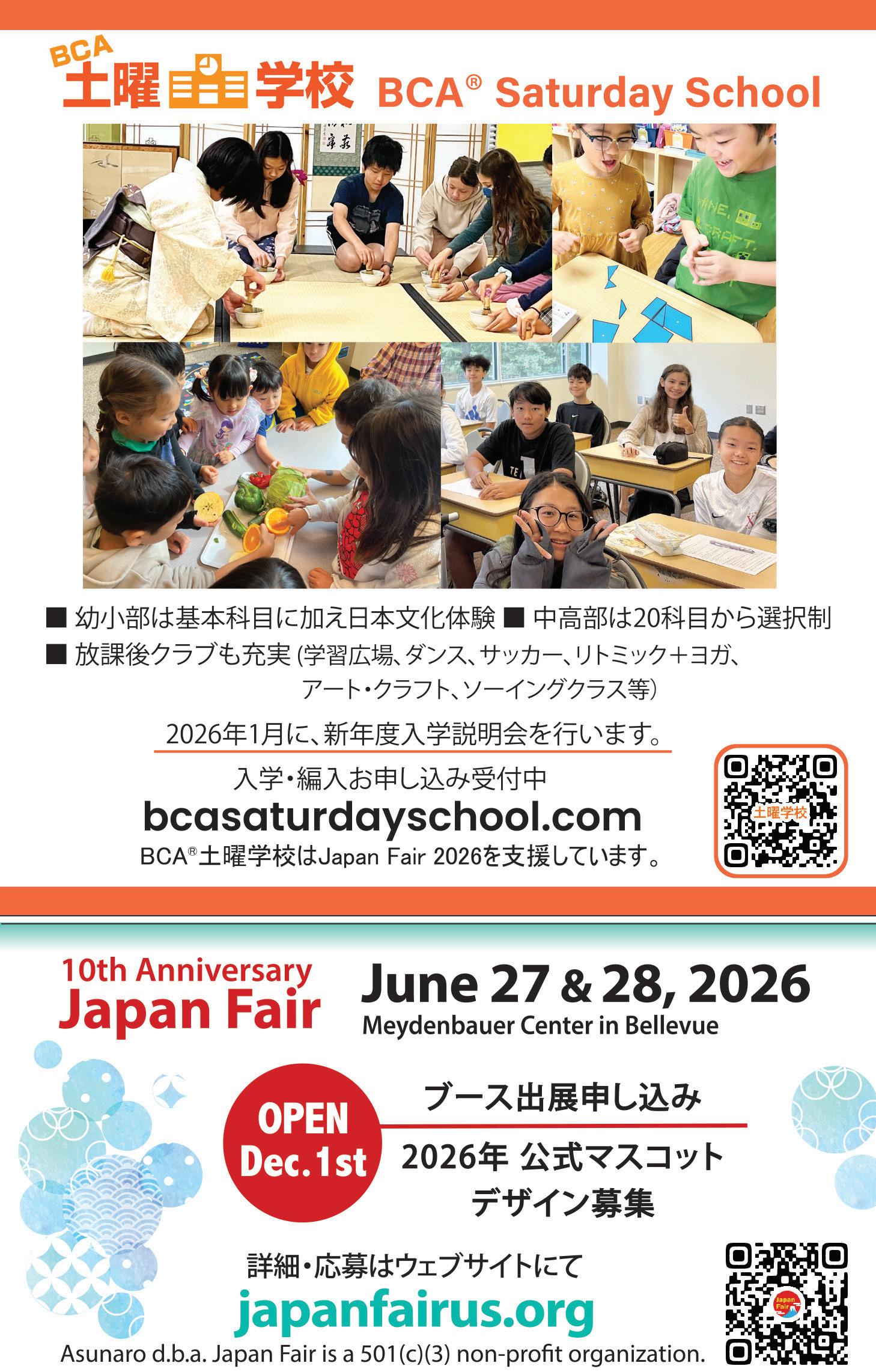 ■入園面接試験 試験日程:2026年1月27日(火)~1月29日(木)10am~4pm ※1月13日(火)以降、各家庭にメールで通知。 試験会場:学校事務所 試験内容:園児個人面接(日本語) ■試験結果 2月中旬以降、各家庭へ郵送 問い合わせ:☎425-643-1661、office@seattlejschool.org 詳細:https://seajschool.org/page/new-transfer-students