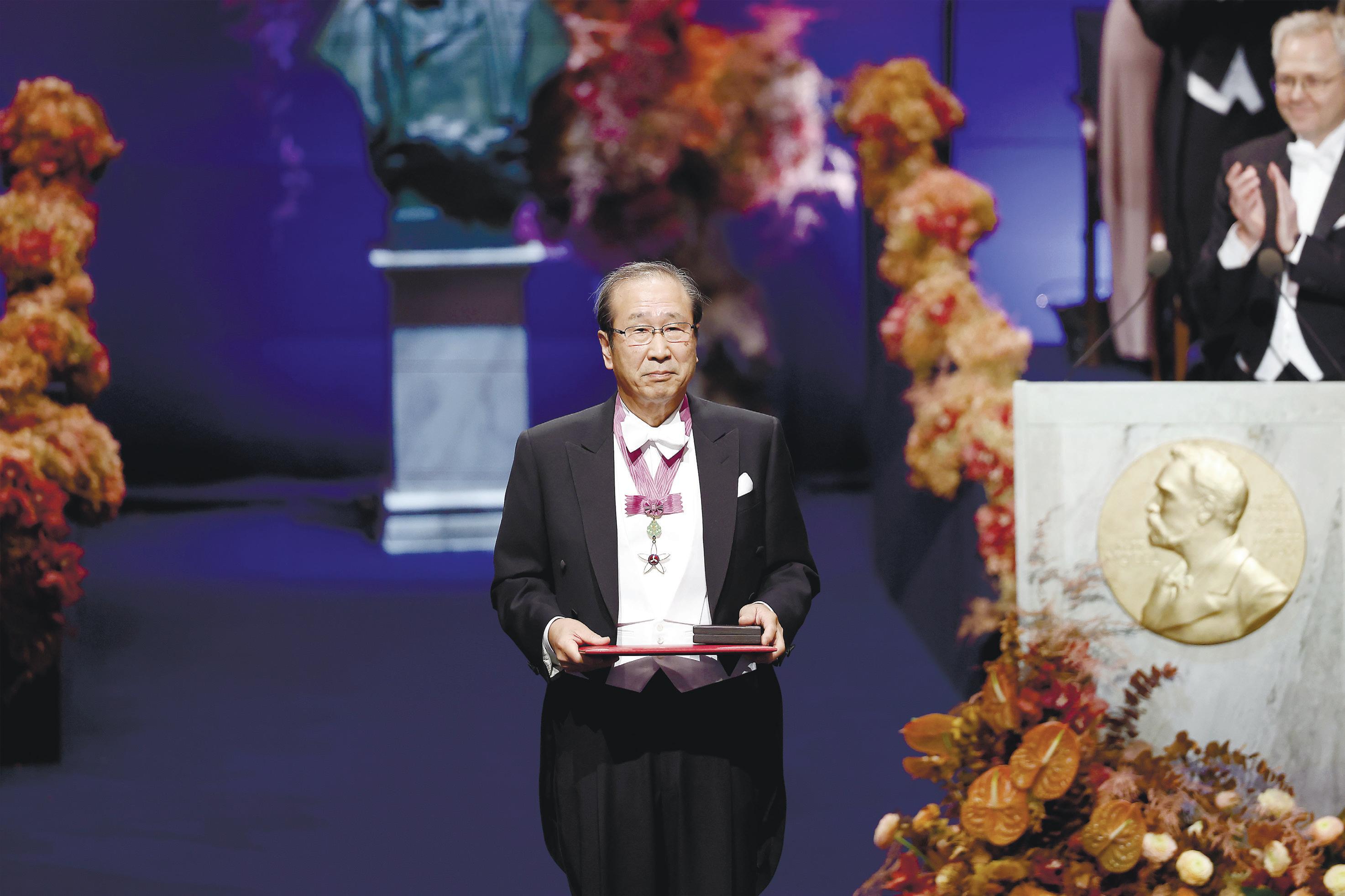 台 に 登 場 じょう 。 物 理り 学 賞 しょう 化か 学 賞 しょう 、 生 理り 学 ・ 医い 学 賞 しょう の 順 じゅん に、それぞれの 業 ぎょう 績 が 選 考 委い 員 説 明 された 後 、 受 賞 しょう 者 が 1 人ずつ スウェーデンのカール 16 世 グスタフ 国 王 から、メ ダルと 賞 しょう 状 じょう を 受う け 取と した。 客 きゃく 席 に 向む かってお じぎをすると 大 拍 手 が 送 られました。 坂 口 さんは、 体 からだ を 守 る しくみである