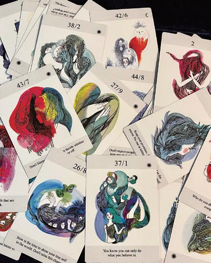 そんな中で、ジュノさんはリビさんのスケッチブックを目にする。そこに描かれた作品 に強く引かれ、スケッチ画を取り入れたカードの制作アイデアが生まれ、実現に至った。 数秘術をもとに作られたKUKURIカードの言葉は、どれも鋭い。「みんながそう思う からって 一体誰の人生なのよ」「条件付きの愛情はもういらないと宣言するの」「十分に 弱っている それが分かると強さが生まれる」。使い方はいくつかある。その一つは44 枚のカードを裏返し、直感で選んだカードの言葉を自分へのメッセージとして受け取る方 法。目を背けてきた本音を引き出すことが、このカードの核心だ。