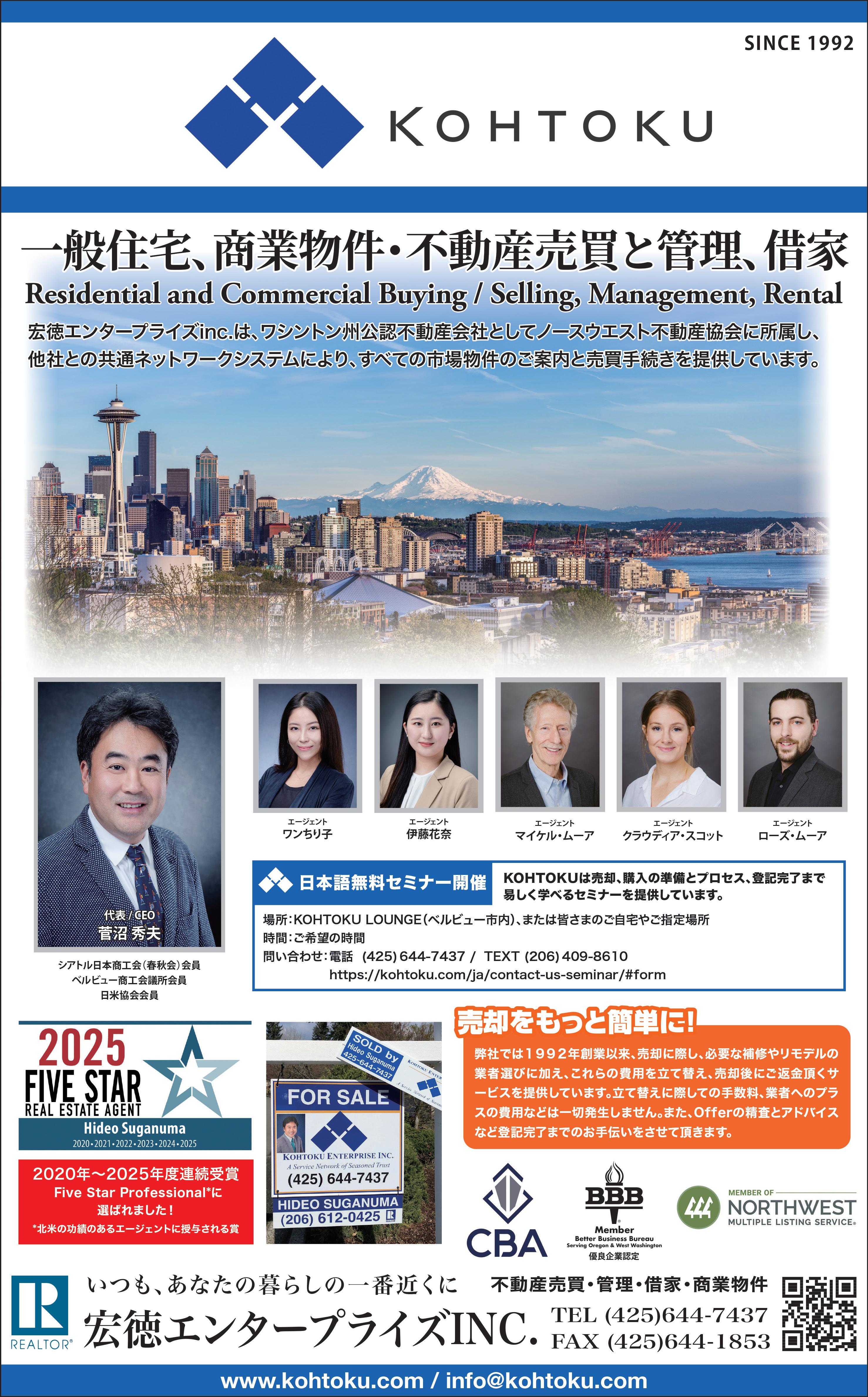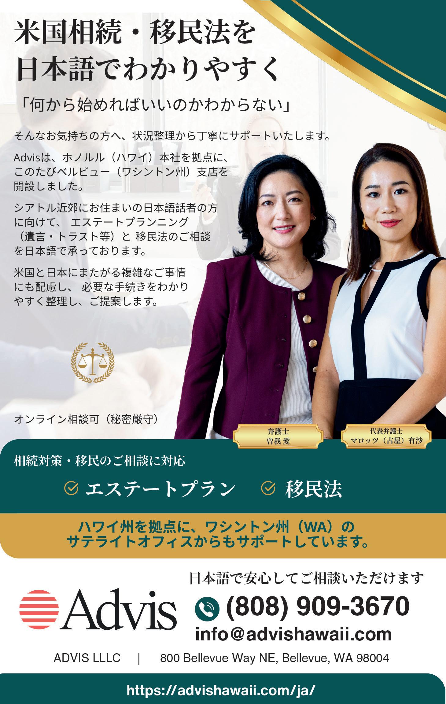 問い合わせ:☎425-445-7391、info@sugamoadvance.com
