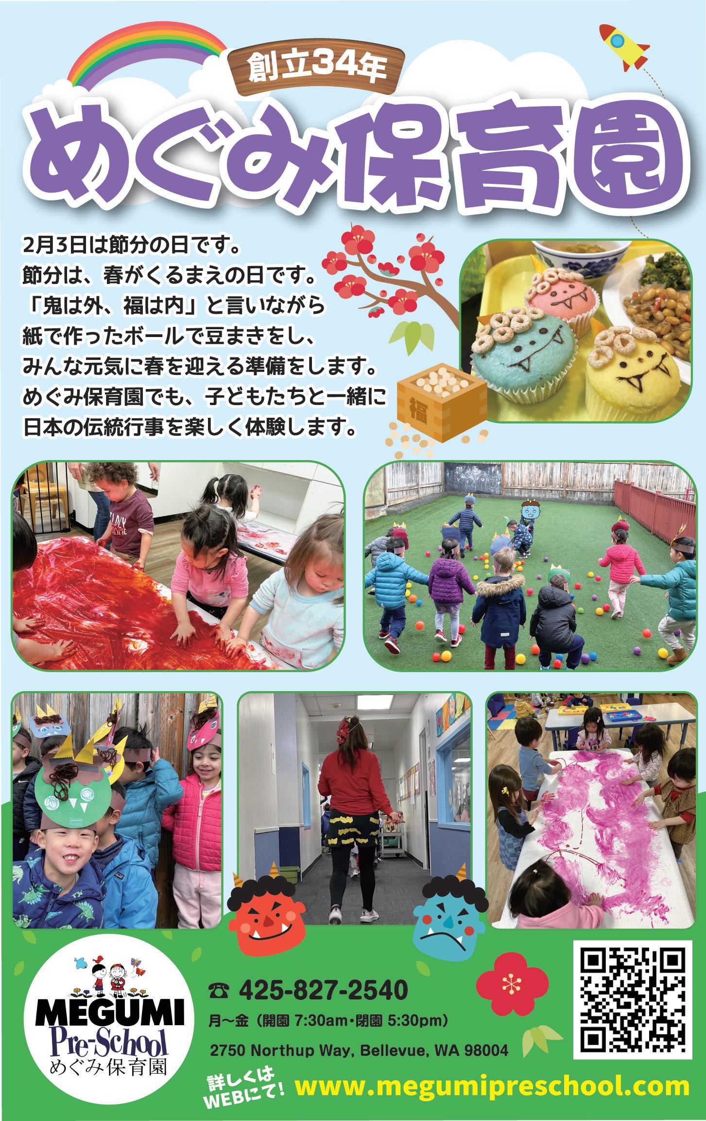 ●見学:随時受付、体験:要問い合わせ 場所:Megumi Preschool 2750 Northup Way, Bellevue, WA 98004 問い合わせ:☎425-827-2540 bellevue@megumipreschool.com