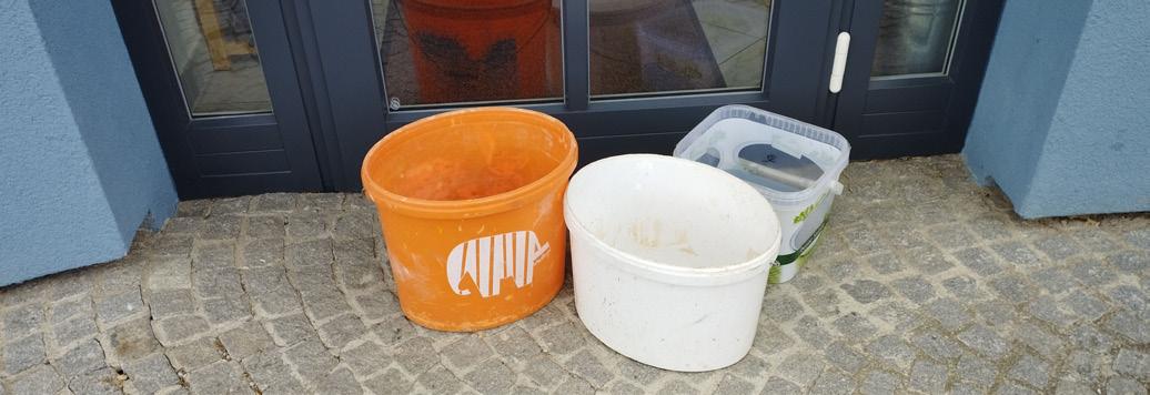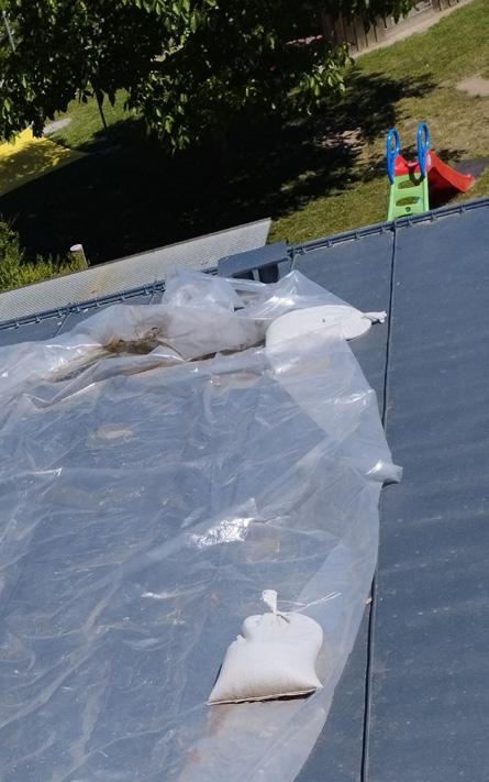 Seit mehr als vier (4) Jahren ist bekannt, dass das Kindergartendach mehrere undichte Stellen hat. Bei Starkregen tropft es in den Gruppenraum. Es kommt auch vor, dass Wasser aus den Lampenauslässen runtertropft. An den Leimbindern sind bereits mehrere Wasserschäden sichtbar. Am Dach liegt seit Jahren eine Plastikplane, die mit Sandsäcken vor dem Verwehen beschwert ist. Wer wohl für das Unterstellen der Kübel zuständig ist?