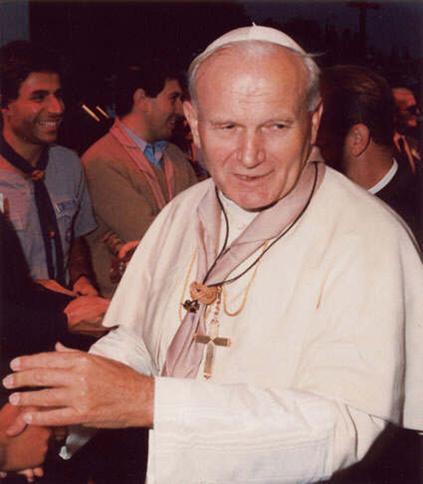 El Papa Juan Pablo II, durante la recepción a Responsables Scouts. Como puede apreciarse, el Papa lleva al cuello la pañoleta, el nudo gilwell y los tizones que le identifican como poseedor de la Insignia de Madera.