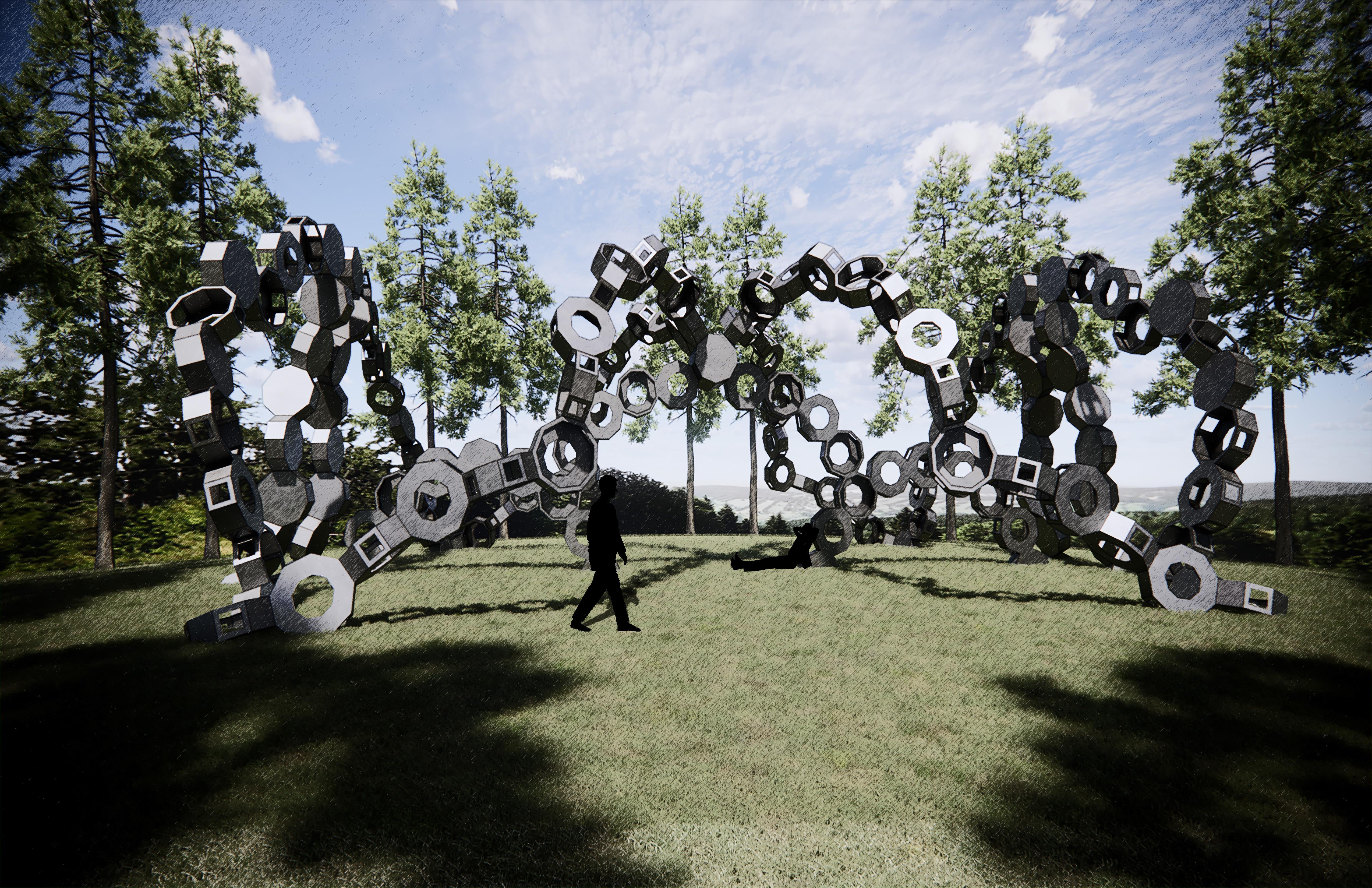 The Gear Pavilion is a continuous pattern pavilion made of enneagonal prisms. It’s a steel structure surrounded by strategically placed trees in an open field.