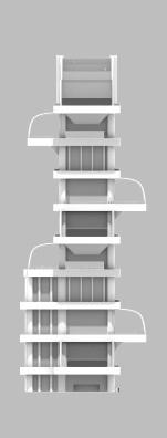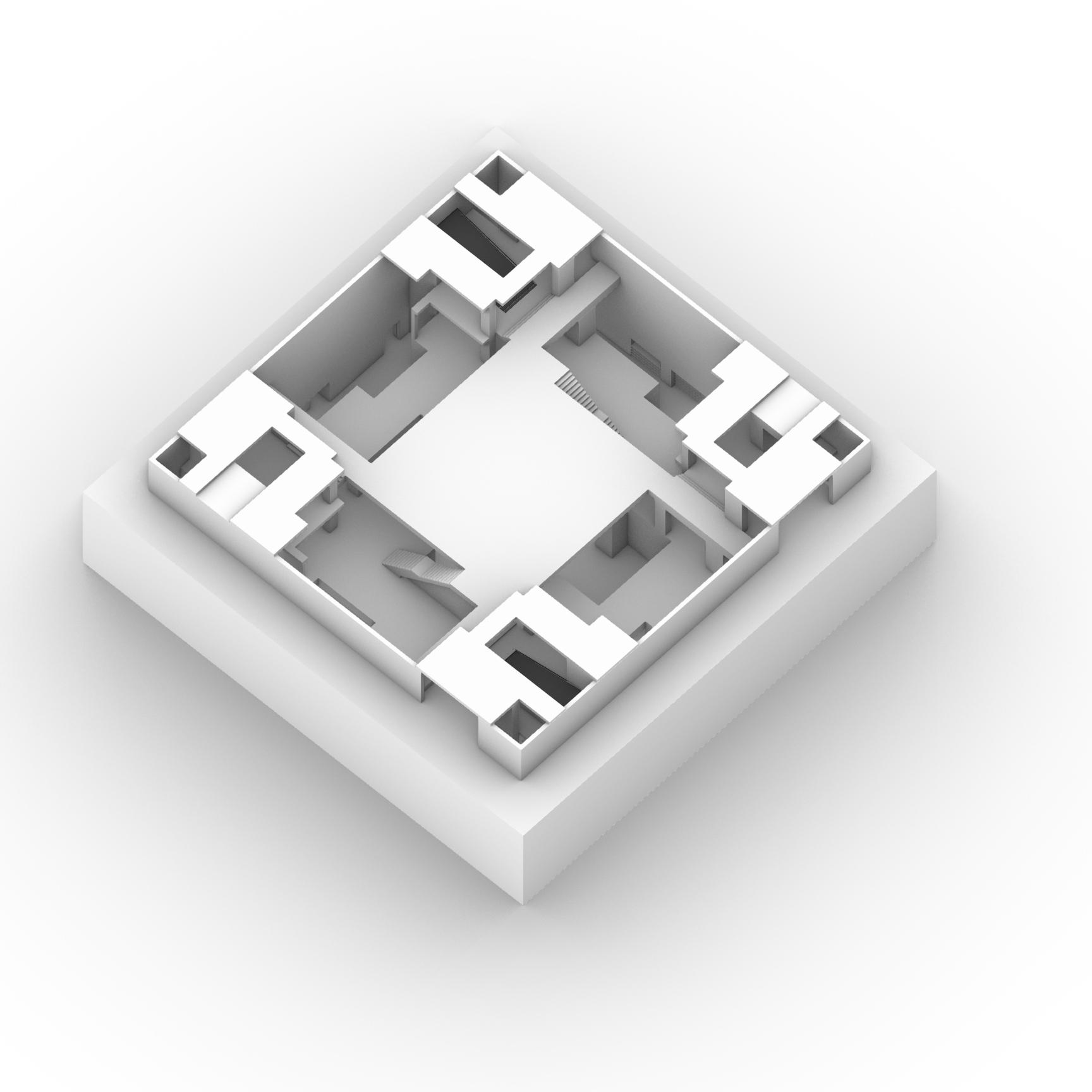 East ViewThe plans follow the first conceptual diagram: A defined central element, followed by 2 pairs of different elements in opposing quadrants, therefore defining all corners. In the plans, the central element is typically a lack thereof, or a void. The corner quadrants consist of units and fire stairwells.