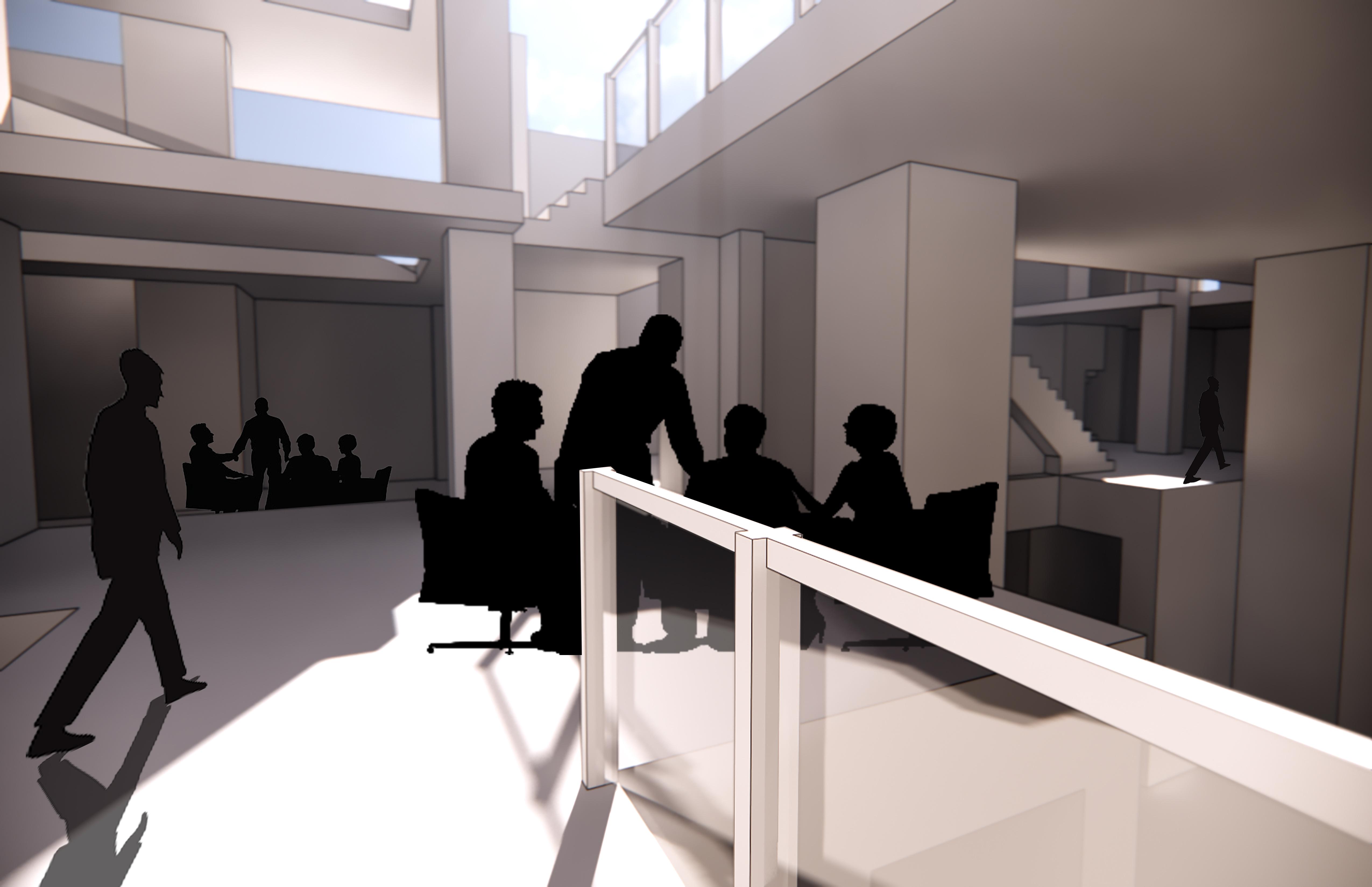 The colors of the space will get colder/darker as you progress through the entire building. AS THIS HAPPENS: